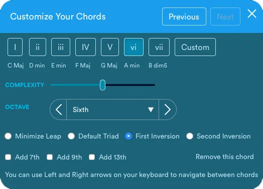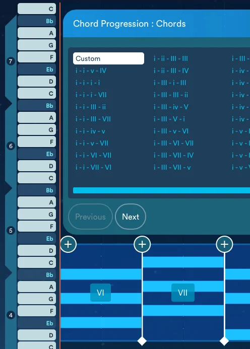 Choose a key and Odesi will make sure that everything sounds great. Want to find the best range for your vocalist? Chords, bass lines, and melodies all transpose together smoothly.